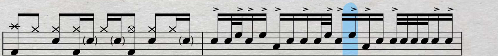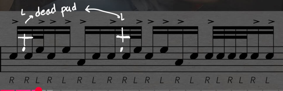 I suggest you play the first bar mainly with your leading hand and only play the few 16th notes with your non-leading hand. In the second bar, consistently play the 16th notes with alternating hands and only the 32nd notes as double-strokes (either with the right or left hand, depending on the subdivision of the bar). However, what I see there is that you'll need some advanced double-stroke technique to play the example as the 32nd notes need to be played with "cross-doubles", meaning double strokes that are spread between two pads (kit pieces), which is a bit harder to play than a double-stroke on just one pad. This technique is taught in the Xtreme chapter of the eBook. Not sure if you've arrived at that place already in your training, but this is where the answer to your questions lies.